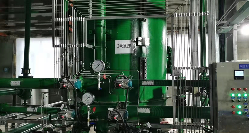 經過反滲透裝置處理的水,仍不符合鍋爐的進水水質要求,其產水須再經過混床作進一步除鹽處理,因此增設混合離子交換器,進一步提高系統產水水質,達到鍋爐補給水要求。